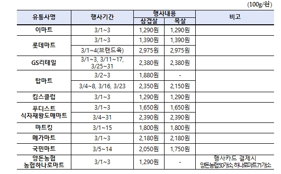또한, 농협유통·하나로유통 판매장에서는 3월 3일까지 행사카드(NH, 국민, 삼성, 롯데, 우리, 전북은행, 카카오페이, 네이버페이, 토스, 페이코)로 결제 시 한돈 삼겹살(100g 기준)을 1,290원에 구매할 수 있다.