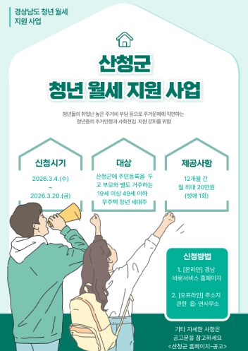 ![]() 산청군, 청년 월세 지원 사업 실시 |
