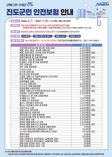 ![]() 진도군, 2026년 군민안전보험 가입… 보장 항목 확대 |