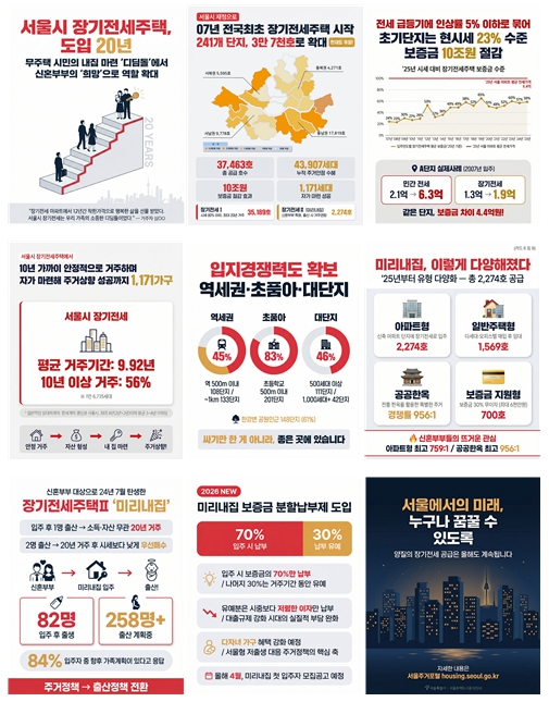 ‘장기전세주택’은 무주택 시민에게 장기간 안정적인 거주 환경을 제공하며 2007년부터 현재까지 241개 단지, 총 37,463호를 공급해 왔다. 지난 2024년에는 신혼부부에 특화된 ‘미리내집(장기전세주택Ⅱ)’을 새롭게 도입해 저출생 대응 주거정책으로 기능을 확대하고 있다. 현재 거주 중인 세대를 포함해 지금까지 총 43,907가구에 안정적인 주거를 제공했다.
