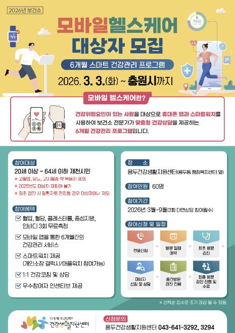 모바일 헬스케어사업은 혈압, 혈당, 콜레스테롤, 허리둘레 등 건강위험 요인을 가진 시민을 대상으로 모바일 앱과 스마트워치를 활용해 총 6개월(24주) 동안 진행하는 비대면 건강관리 프로그램이다. 간호사, 영양사, 운동처방사가 참여자에게 1:1 맞춤형 생활습관 개선 지도를 제공한다.