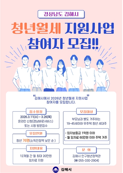 ![]() 김해시, 2026년 청년 월세 지원사업 참여자 모집 |