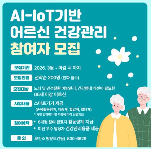![]() 고흥군, 2026년 AI·IoT 활용 어르신 건강관리 신규 참여자 모집 |