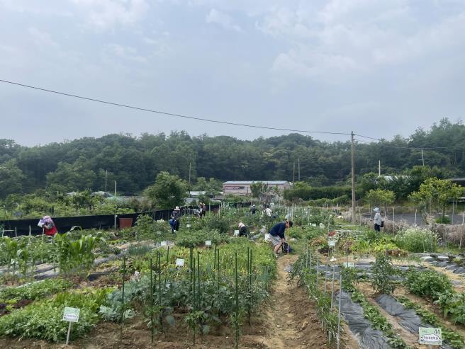 ![]() 구로구 귀농·귀촌교육 수강생들이 텃밭에서 작물 재배 실습을 하고 있다. |