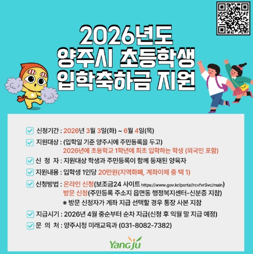 ![]() 양주시, ‘초등학교 입학축하금’ 20만 원 지원 |
