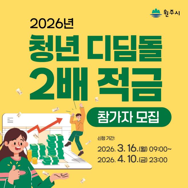 청년 디딤돌 2배 적금은 대상자가 3년간 매월 10만 원씩 저축하면, 기업이 5만 원, 강원특별자치도와 원주시가 각각 2만 5천 원씩 총 10만 원을 매달 적립해 주는 사업이다. 이를 통해 만기 시 본인 저축액 360만 원의 2배인 720만 원을 받을 수 있다.