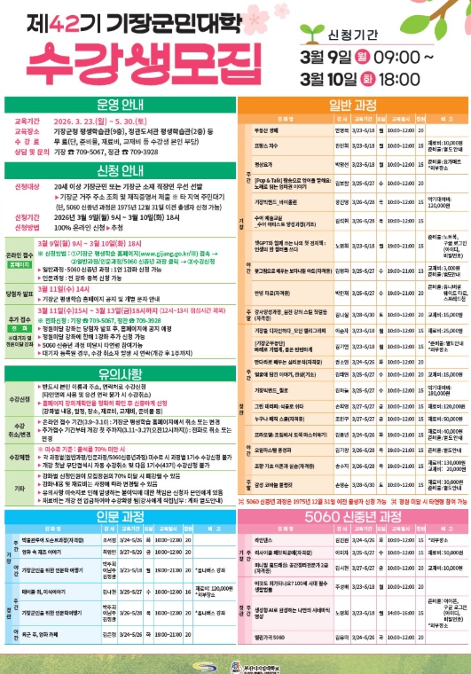 단, 기장군민대학 5060 신중년 과정은 1975년 12월 31일 이전 출생자일 경우 신청이 가능하다. 수강신청은 3월 9일부터 10일 양일간 진행되며, 수강 희망자는 기장군 평생학습 홈페이지에서 신청할 수 있다.