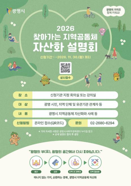 박승원 광명시장은 “지역공동체 자산화는 지역에서 만들어진 가치가 다시 지역으로 돌아와 시민의 삶에 투자되는 지역경제 선순환 구조의 핵심”이라며 “시민과 지역 단체가 함께 참여해 지역의 가치를 키우고 지속가능한 지역경제 기반을 만들어 가길 기대한다”고 밝혔다.