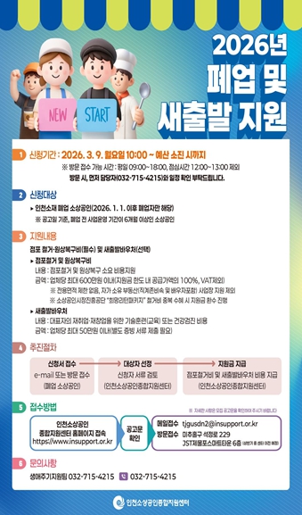 신청·접수는 3월 9일부터 가능하며, 신청과 관련하여 자세한 사항은 인천소상공인종합지원포털과 인천소상공인종합지원센터 누리집을 통해 확인할 수 있다.
