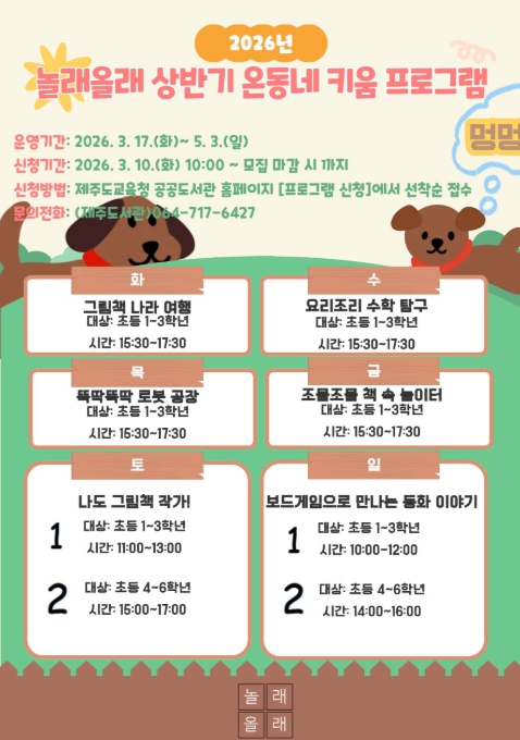 제주도서관 관계자는 “지역 공공시설을 활용한 이번 프로그램을 통해 어린이들이 책과 친해지고 창의적인 사고력을 키우는 계기가 되길 바란다”며 “앞으로도 내실 있는 돌봄 및 교육 서비스를 지속적으로 확대해 나가겠다”고 말했다.