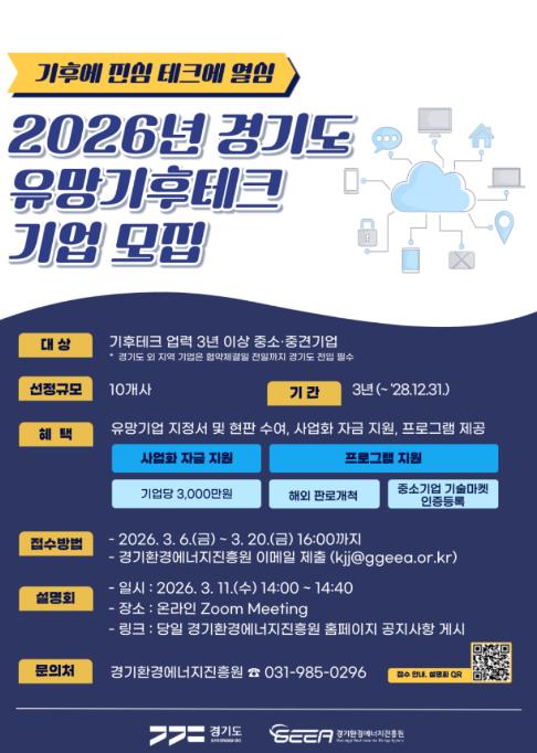 변상기 경기도 기후환경정책과장은 “올해는 단순 자금 지원을 넘어 글로벌 시장 진출과 공공 판로 확보까지 지원 체계를 다각화했다”며 “기후테크 기업들이 탄소중립 시대를 이끄는 미래 산업의 주역으로 성장할 수 있도록 지원을 아끼지 않겠다”고 말했다.