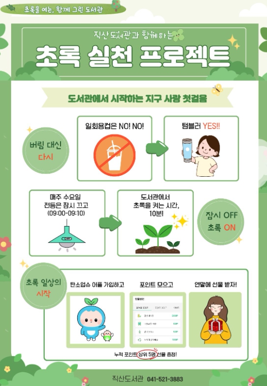 ![]() 천안시 직산도서관 환경 보호 캠페인 ‘초록 실천 프로젝트’ 홍보문. |