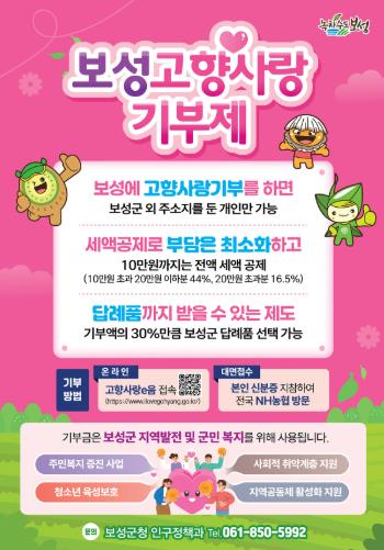 또한 고향사랑기부금으로 조성된 기금은 지역 문제 해결과 주민 복리 증진을 위한 사업에 활용되며, 보성녹차, 벌교꼬막 등 지역 특산품 중심의 답례품 제공을 통해 지역 소상공인의 매출 증대와 지역경제 활성화에도 도움이 될 것으로 기대된다.