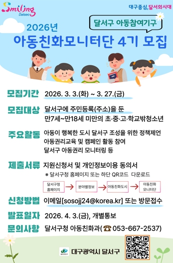 ![]() 2026년 아동친화모니터단 4기 모집 포스터 |