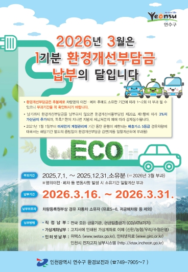 ![]() 연수구, 2026년 1기분 환경개선부담금 부과 |