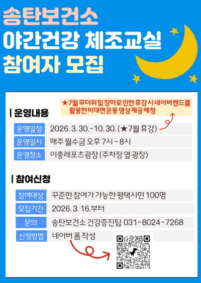 송탄보건소 관계자는 “올해 야간건강 체조교실은 시민들이 규칙적으로 운동하는 습관을 기를 수 있도록 운영하고, 무더위 휴강 기간에는 비대면 운동 프로그램도 함께 제공해 꾸준히 건강관리를 이어갈 수 있도록 준비했다”며 “앞으로도 시민 눈높이에 맞는 건강증진 프로그램을 지속적으로 추진하겠다”라고 말했다.