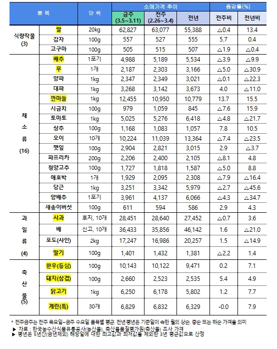 ![]() 주요 농축산물(28개 품목) 소비자가격 동향(3.13일 기준) |