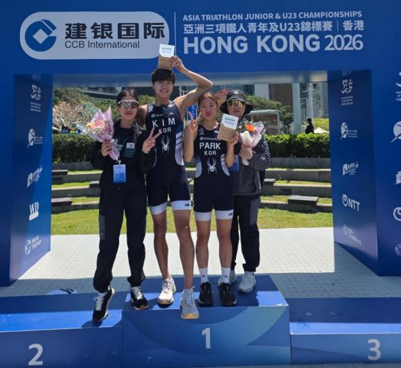 ![]() 2026 홍콩 아시아 트라이애슬론 선수권대회 U-23 남자부에서 은메달을 획득한 김태기 선수(가운데)가 한국 선수 및 관계자들과 포디움에 올라 기뻐하고 있다. |
