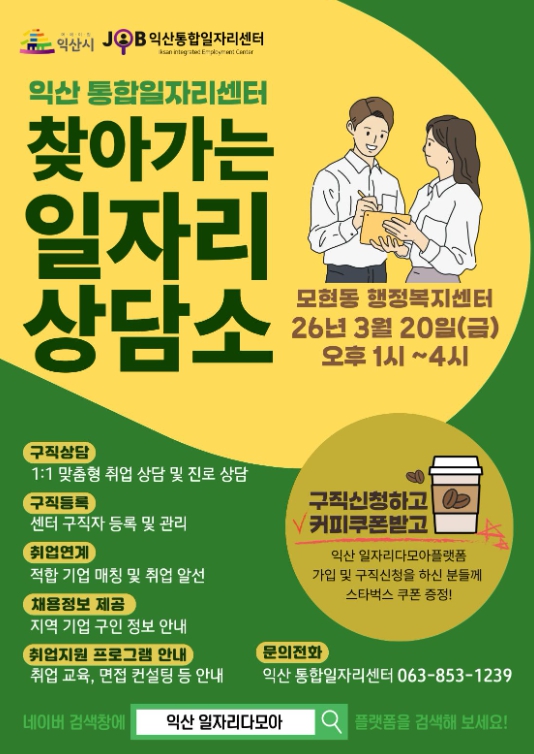 익산시 관계자는 "찾아가는 일자리 상담소는 시민들이 일상 속에서 보다 쉽게 취업 지원 서비스를 이용할 수 있도록 마련한 현장 중심 일자리 정책"이라며 "앞으로도 시민이 체감할 수 있는 맞춤형 일자리 서비스를 지속적으로 확대해 나가겠다"고 말했다.