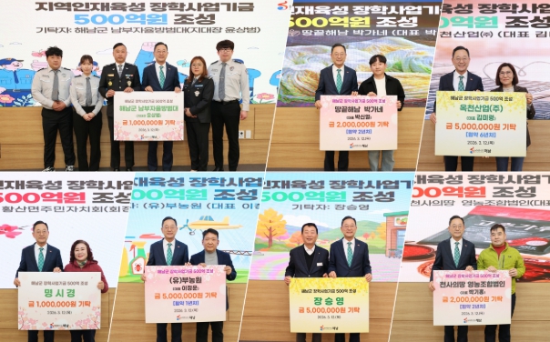 지난 12일 군청에서 열린 장학사업기금 기탁식에는 지역 기업과 단체, 개인들이 참여해 장학기금을 전달하며 해남 인재 육성에 힘을 보탰다. 참석자들은 지역과 함께 성장하는 교육 환경을 만들기 위해 장학사업기금 조성에 지속적으로 동참하겠다는 뜻을 전했다.