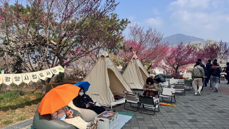 광양시립도서관은 매화축제 기간 동안 매화문화관 일원에 야외 독서공간과 체험 프로그램을 결합한 팝업도서관 ‘비밀의 정원’을 운영하고 있다.