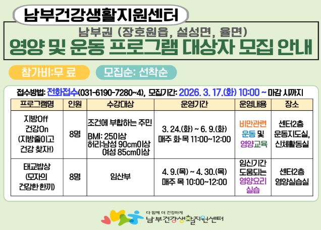 이번 프로그램은 다양한 계층을 대상으로 비만 예방·관리를 지원하는 ‘지방Off 건강On(지방 줄이고 건강 찾자!)’교실과 임산부의 영양 관리를 돕는 ‘태교밥상(모자의 건강한 한 끼)’교실 프로그램을 구성해 2026년 3월 17일부터 신청을 받고 있다.