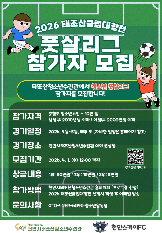 ![]() ‘2026 태조산 클럽대항전 풋살리그’ 참가팀 모집 홍보 포스터. |