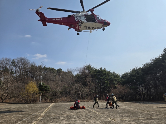 주요 훈련 내용은 ▲구조대상자 응급처치 등 실제 상황을 가정한 실전형 훈련 ▲산악구조 장비 사용법 숙달 및 소방헬기 접근 안전교육▲소방헬기 호이스트를 이용한 환자 인양 및 로프 구조 기술 고도화 훈련으로 진행됐다.