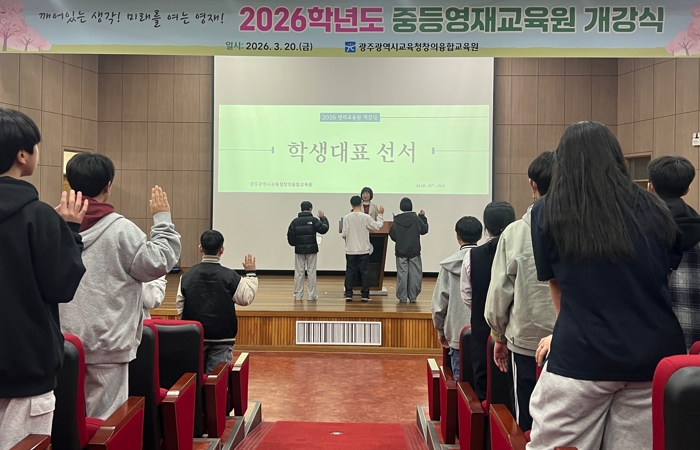 ![]() 광주시교육청창의융합교육원은 20일 본원 대강당에서 열린 ‘2026학년도 중등영재교육원 개강식’에서 참여 중학생 203명이 개강선서를 하고 있다. |