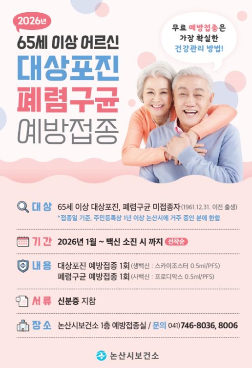 접종 대상은 접종일 기준 논산시에 1년 이상 주민등록을 둔 만 65세 이상(1961년 이전 출생자) 시민으로, 기존 접종 이력이 있거나 백신 금기자는 제외된다.