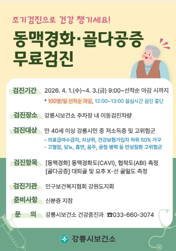 ![]() 강릉시, 동맥경화 및 골다공증 무료 검진 실시 |