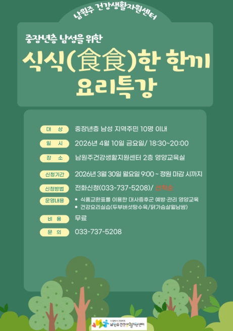 모집 대상은 중장년층 남성 지역 주민 10명 이내며, 3월 30일 오전 9시부터 선착순으로 모집한다. 참가 신청 등 자세한 사항은 남원주건강생활지원센터로 문의하면 된다.