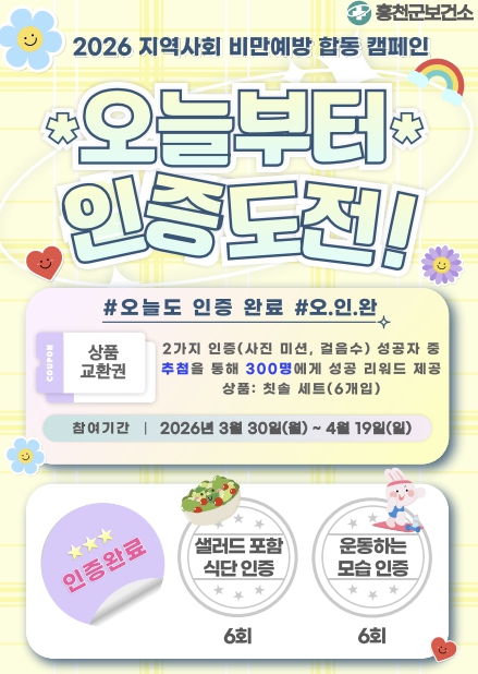 ![]() 홍천군보건소, 봄맞이 3주 건강 챌린지 '#오늘도 인증완료' 운영 |