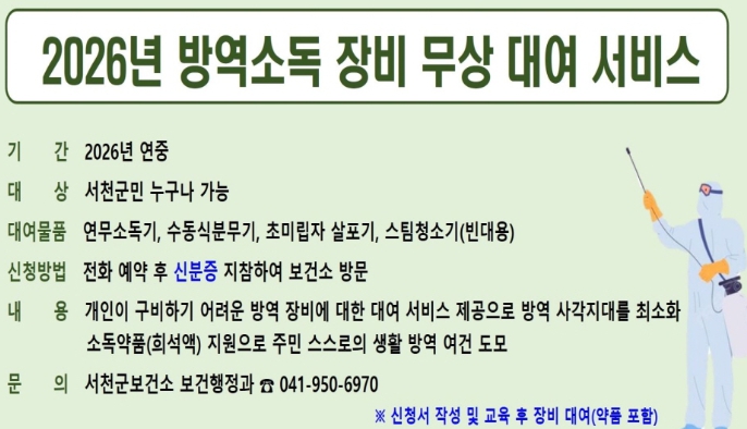 대여 대상은 서천군민 누구나 가능하며, 대여 장비는 연무소독기, 수동식 분무기, 초미립자 살포기, 스팀청소기(빈대용) 등 총 4종이다.