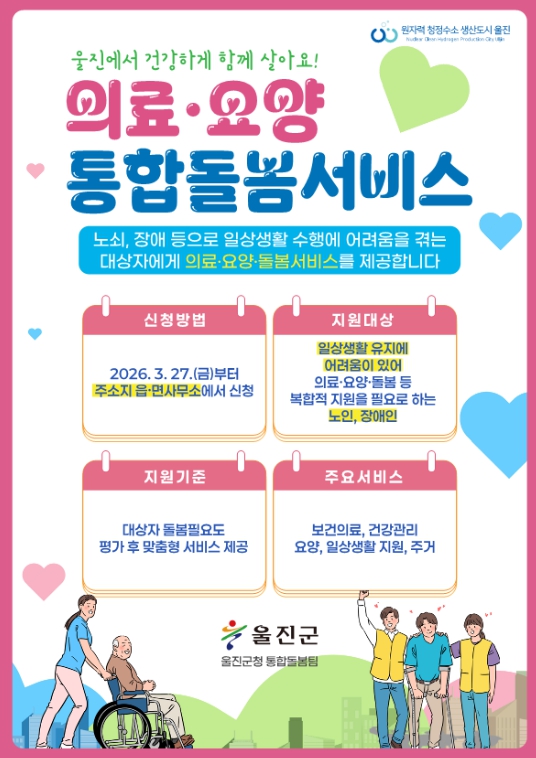울진군 관계자는“의료요양 통합돌봄을 통해 돌봄이 필요한 주민이 살던 곳에서 건강한 삶을 이어갈 수 있도록 사업홍보와 대상자 발굴에 최선을 다하겠다”라고 말했다.