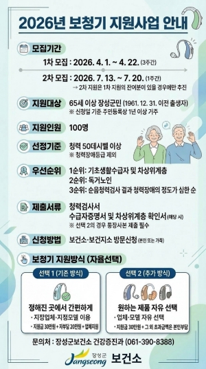 ![]() 장성군이 65세 이상 난청 주민의 보청기 구입을 지원한다. |