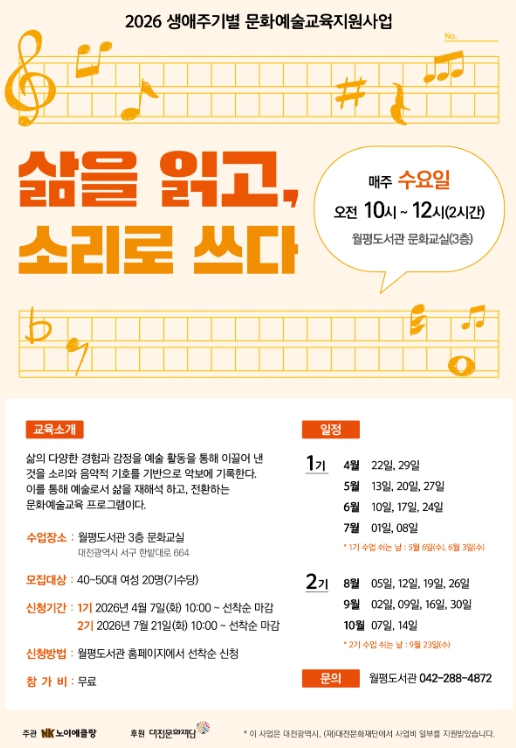 ‘삶을 읽고, 소리로 쓰다’는 이달 7일 오전 10시부터, ‘선율과 문장’은 21일 오전 10시부터 월평도서관 홈페이지에서 선착순으로 모집한다.