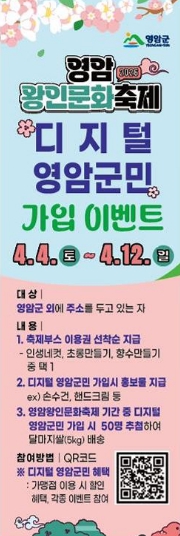 김선미 영암군 인구청년과장은 “디지털 영암군민은 누구나 1분이면 간편하게 가입할 수 있다”며 “축제를 찾은 방문객들이 디지털 군민이 되어 영암과 지속적인 인연을 이어가길 바란다”고 말했다.