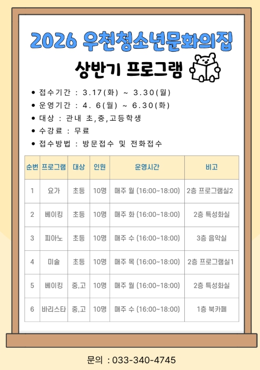 상세문의는 우천청소년문화의집으로 하면 된다.