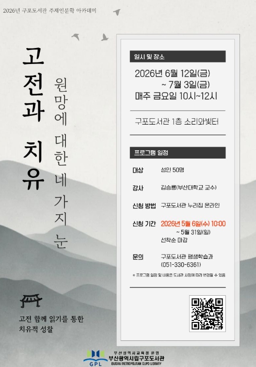신미향 구포도서관장은 “이번 인문학 아카데미가 지역 주민들이 부산을 보다 깊이 이해하고, 삶의 지혜를 통해 내면을 단단히 다지는 의미 있는 시간이 되길 바란다”며 “앞으로도 다양한 인문학 프로그램을 통해 지역사회 문화 수준 향상에 기여하겠다”고 말했다.