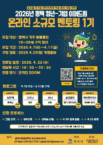 이번 1기 멘토링은 오는 22일 온라인(ZOOM)을 통해 진행되며, 평택에 거주하거나 활동 중인 19세부터 39세까지의 구직 청년 25명을 대상으로 한다. 5개의 글로벌·대기업 현직자들이 참여하며, 멘토 1명당 청년 5명이 참여하는 소규모 방식으로 운영된다. 이를 통해 취업 정보와 준비 전략, 직무 관련 질의에 대해 현직자의 생생한 경험과 실질적인 조언을 제공할 예정이다.
