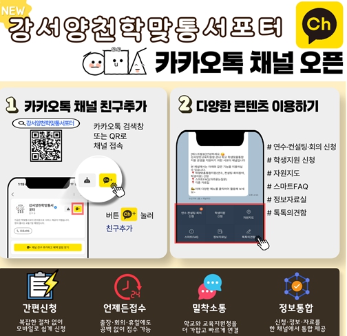 서울특별시강서양천교육지원청은 “이번 카카오톡 채널은 단순한 소통 수단을 넘어, 학교와 교육지원청이 실시간으로 연결되는 현장 밀착형 지원 플랫폼”이라며, “앞으로도 학생맞춤통합지원이 학교 현장에 안정적으로 안착될 수 있도록 적극 지원하겠다”라고 밝혔다.