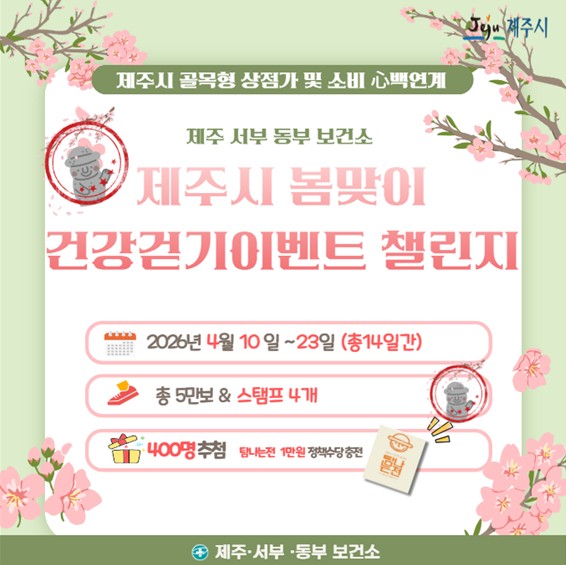 한편, 제주시는 모바일 앱 ‘워크온’을 활용해 2월부터 11월까지 매월 21만 보 달성을 목표로 하는 ‘꼬닥꼬닥 걷당보민’ 건강 걷기 챌린지도 운영 중이다.