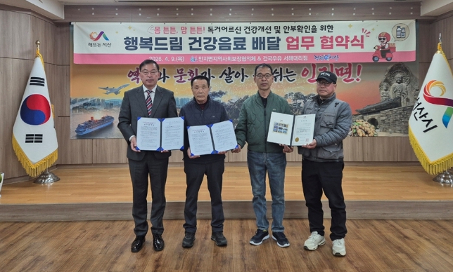 ![]() 4월 9일 인지면지역사회보장협의체 「행복드림 건강음료 배달」 추진을 위한 건국우유 서해대리점과의 업무협약식에서 |