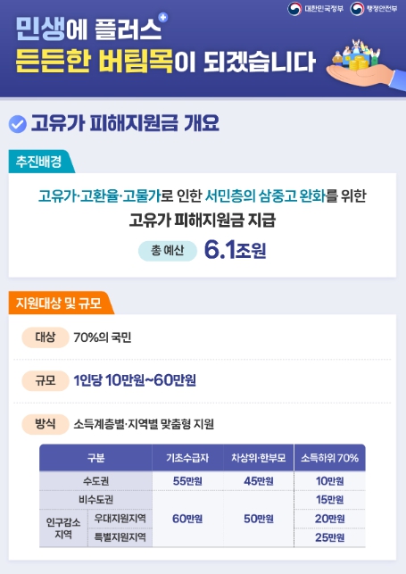 지난 10일 국회에서 확정된 이번 고유가 피해지원금 사업은 중동전쟁으로 인한 고유가 · 고물가 등 국민 부담 경감을 목적으로 하며, 국민의 70%를 대상으로 소득계층별 · 지역별로 1인당 10만원에서 최대 60만원까지 차등 지원한다.