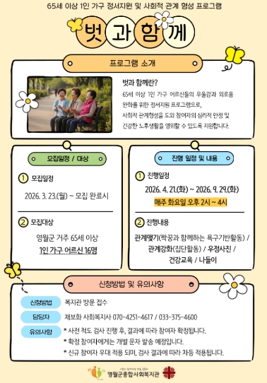 ![]() 어르신 1인가구 프로그램 ‘벗과 함께’ 참여자 모집 |