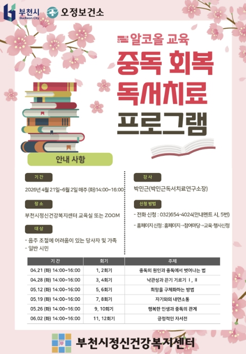프로그램은 총 6주간 12회기로 구성되며, 음주 조절에 어려움을 겪고 있거나 건전한 음주문화에 관심 있는 관내 시민이면 누구나 참여할 수 있다. 신청은 4월 20일까지 부천시정신건강복지센터 홈페이지 또는 전화를 통해 선착순으로 받는다.