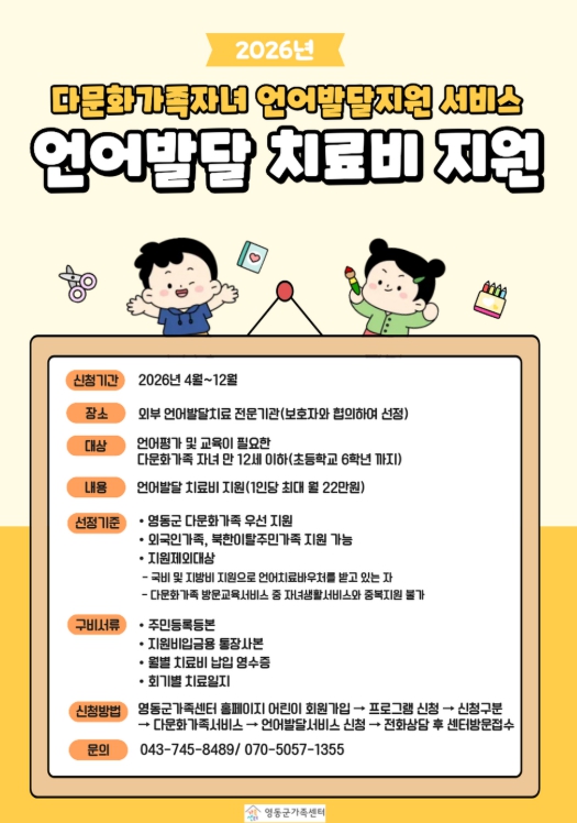 영동군가족센터 관계자는 “이번 사업을 통해 다문화가족 자녀들이 안정적으로 언어발달을 이룰 수 있도록 지원하고, 지역사회 적응에도 도움을 줄 것으로 기대한다”며 “대상 가정의 많은 관심과 참여를 바란다”고 말했다.