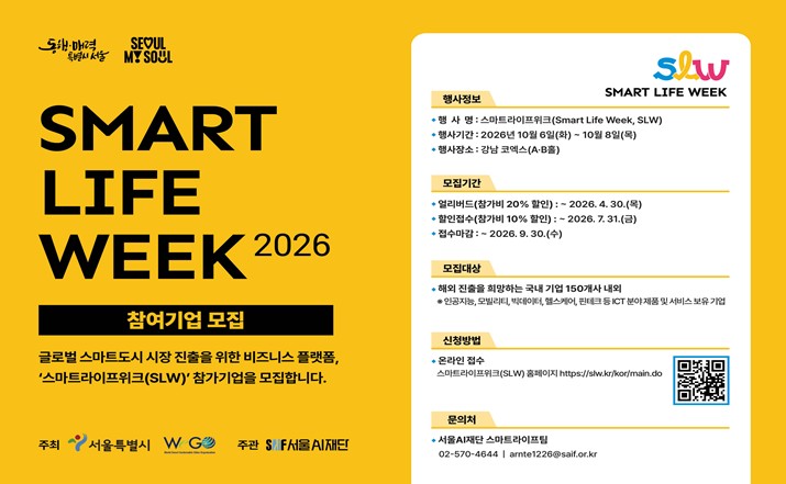 시는 ‘AI로 그리는 미래도시의 일상’을 주제로 10월 6일부터 8일까지 코엑스에서 ‘SLW 2026’을 개최하고, 이에 참여할 국내 기업을 9월 30일까지 모집한다.