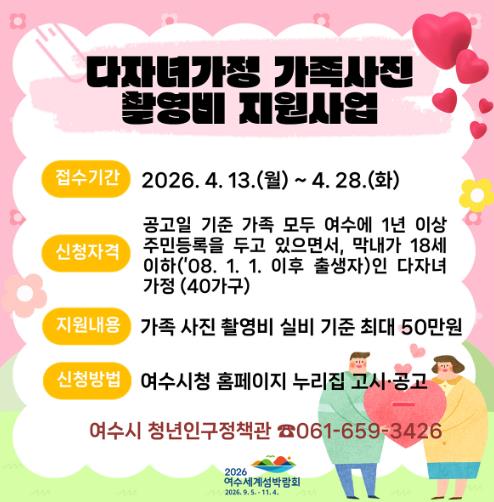 신청 대상은 공고일인 4월 13일 기준 부모와 자녀 모두 여수시에 1년 이상 거주 중이고, 막내 자녀가 18세 이하(2008년 1월 1일 이후 출생)인 둘째아 이상 다자녀 가정이다.